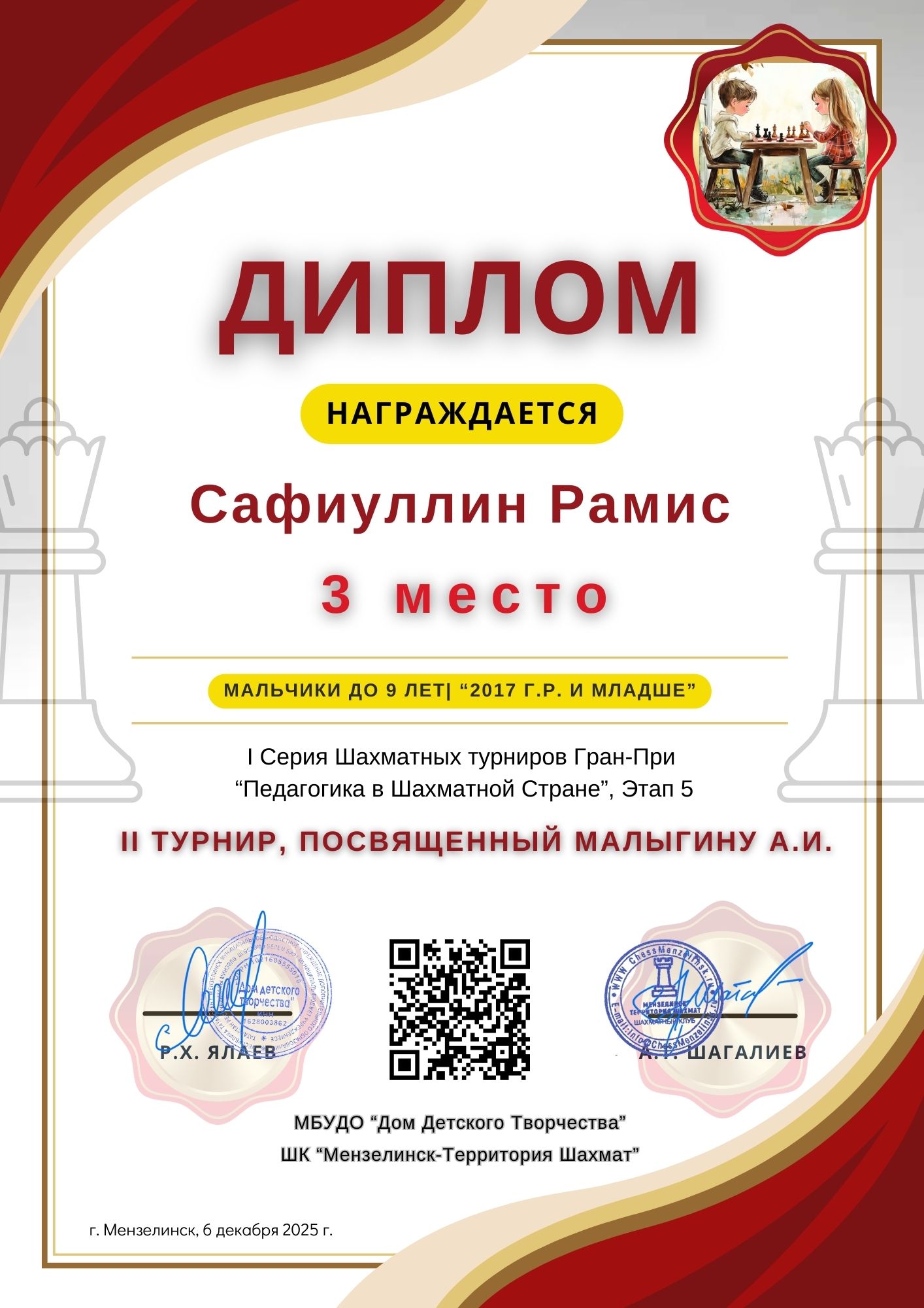 2025.07.19| г. Мензелинск 3 место| 2013 г.р. и мл.| Первенство РТ по шахматам Фишера среди любителей" Чуркин Даниил |