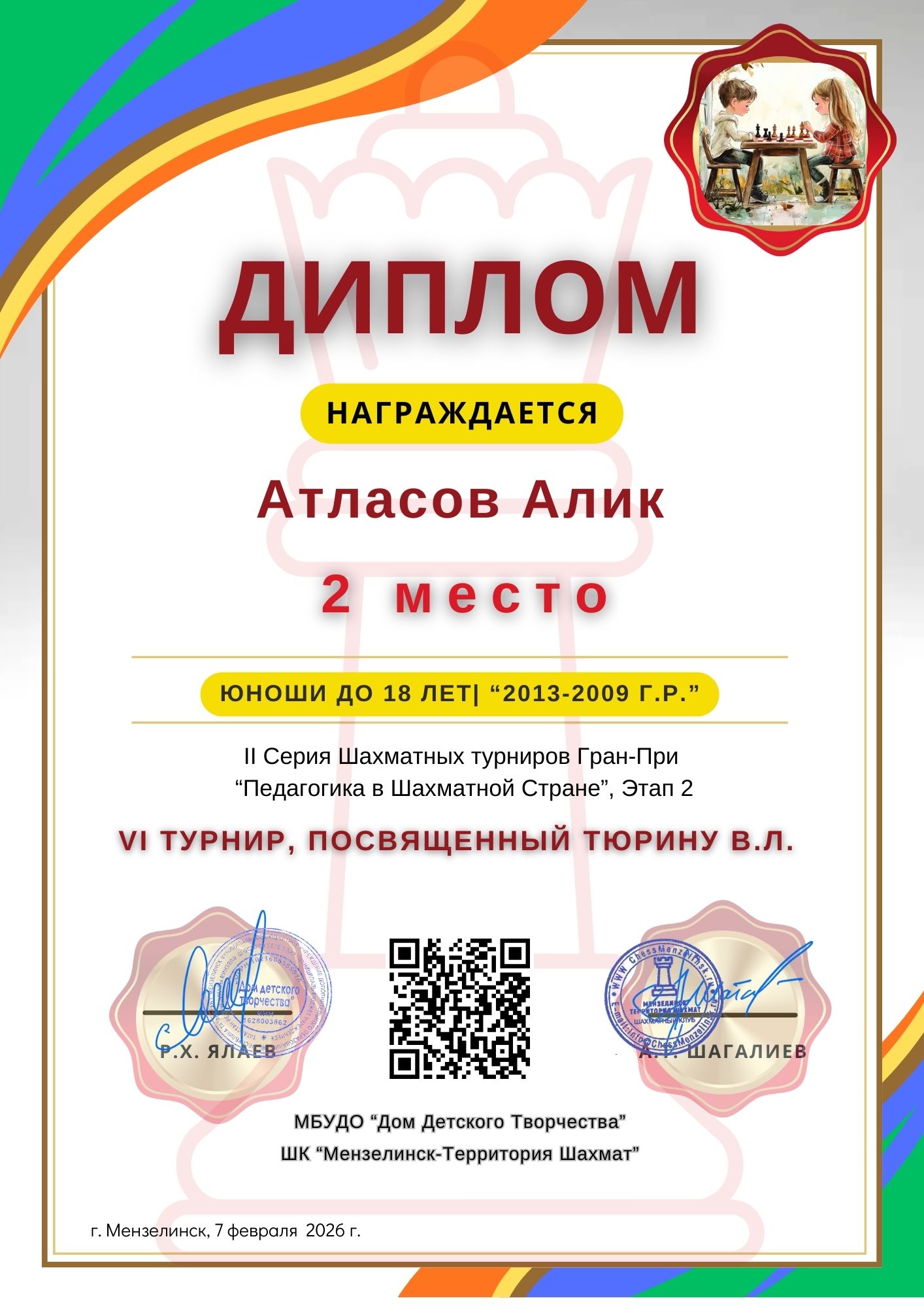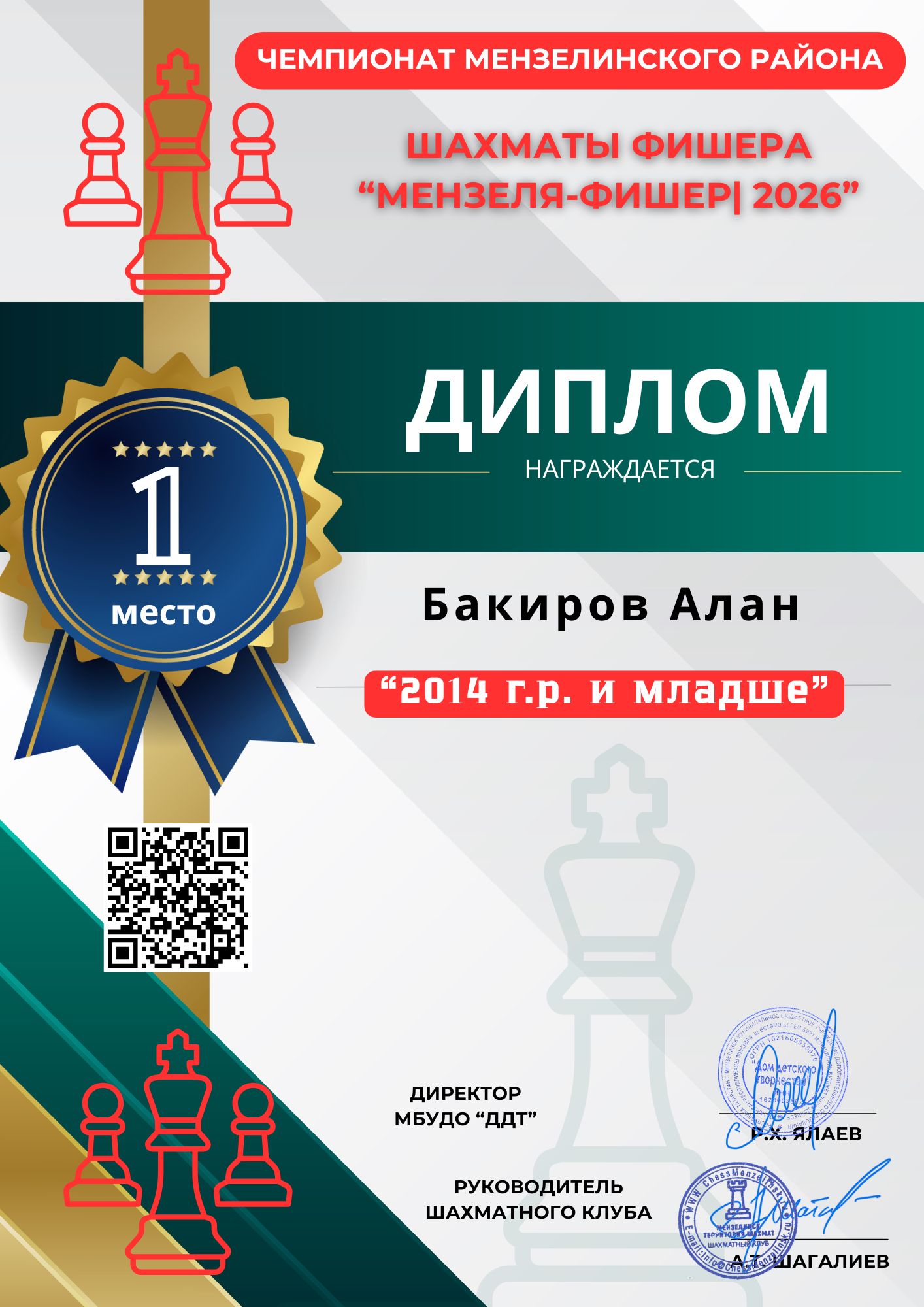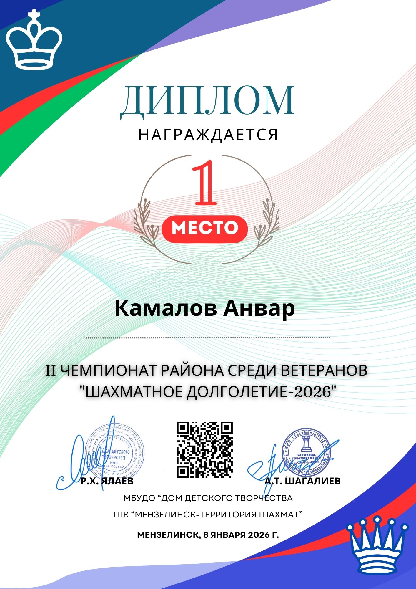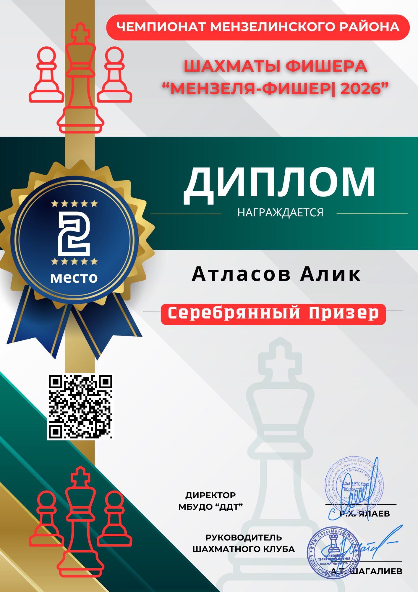 ![]() 2026.01.05| г. Мензелинск Чемпионат района по шахматам Фишера Общий Зачет, 2 место Атласов Алик |