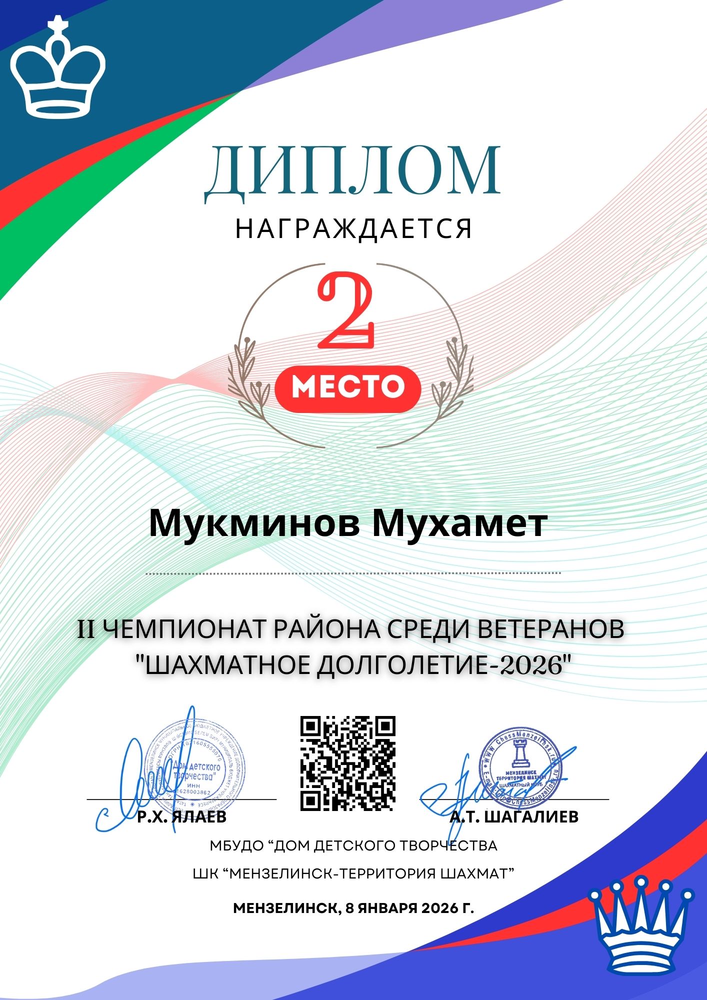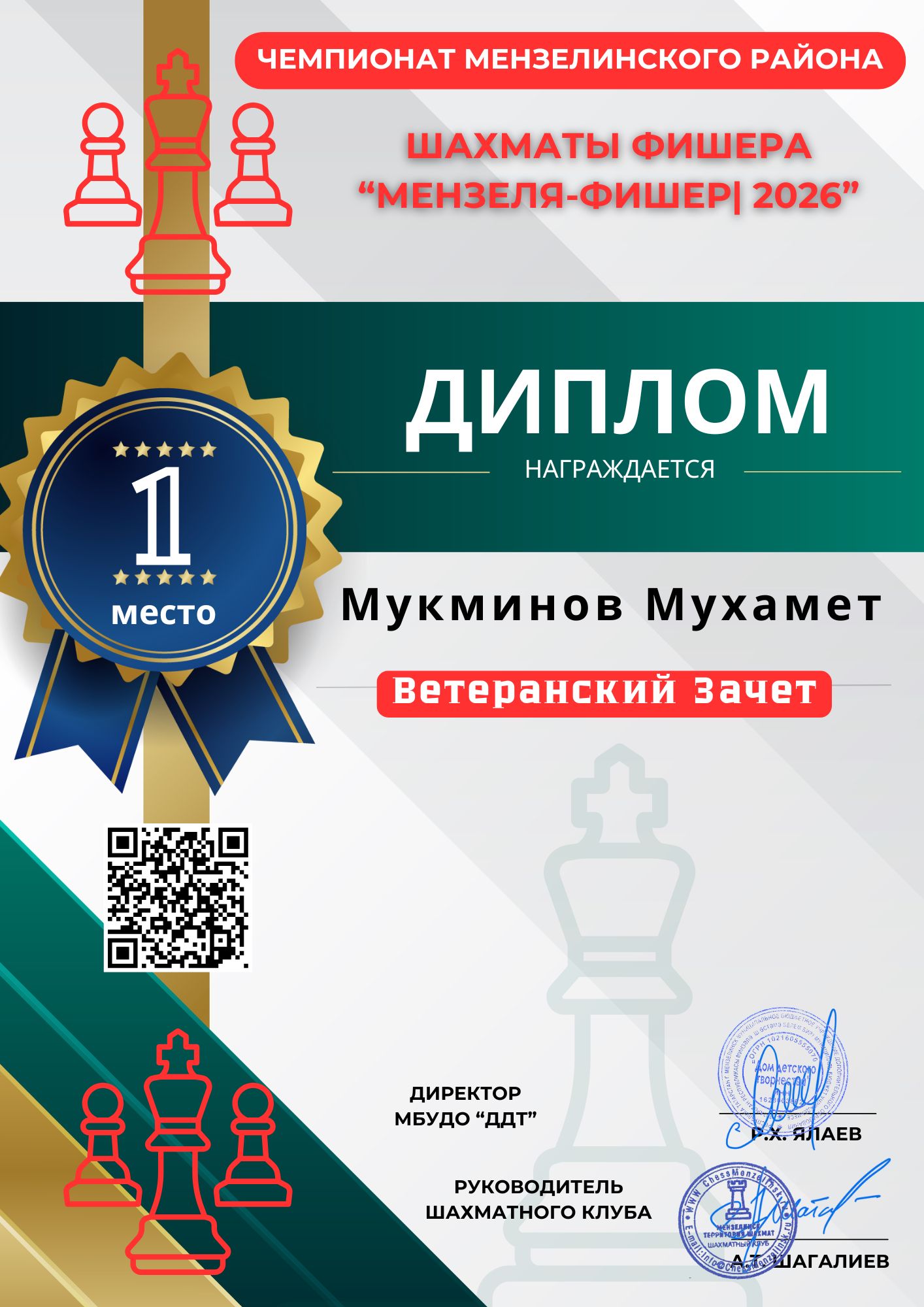 ![]() 2026.01.05| г. Мензелинск Чемпионат района по шахматам Фишера Ветеранский Зачет Мукминов Мухамет |