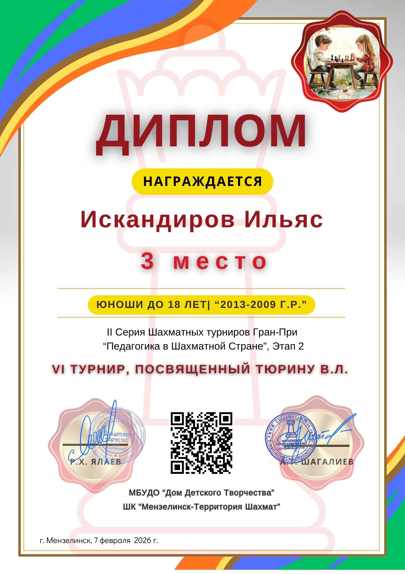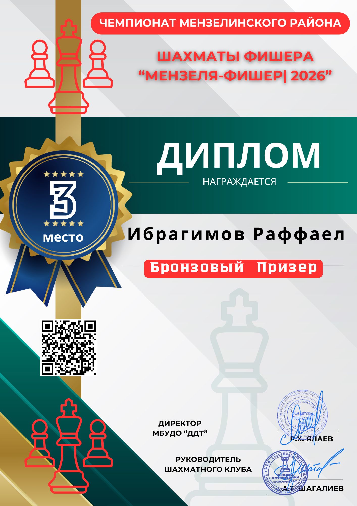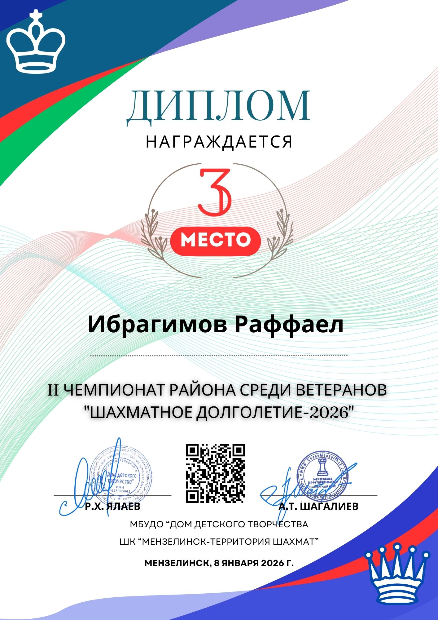 ![]() 2026.01.05| г. Мензелинск Чемпионат района по шахматам Фишера Общий Зачет, 3 место Ибрагимов Раффаел |