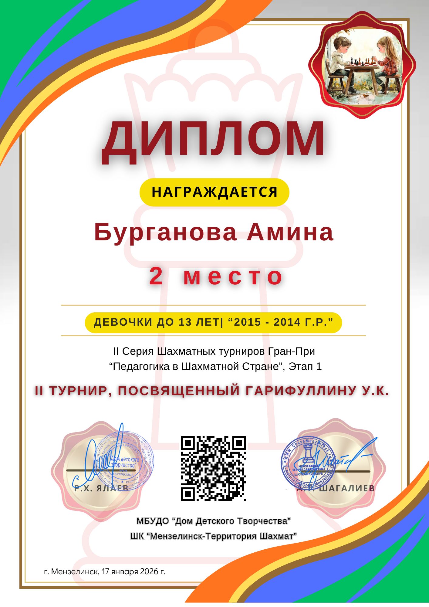 ![]() 2026.01.17| г. Мензелинск 1 этап, II Серия "ПвШС" Девочки-ВЗ"2015-2014 г.р.", 2 место Бурганова Амина |