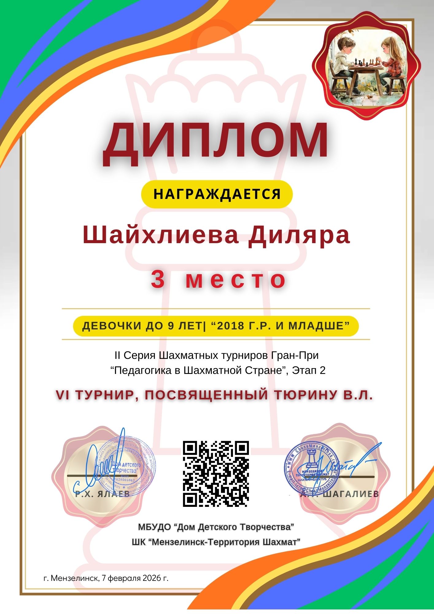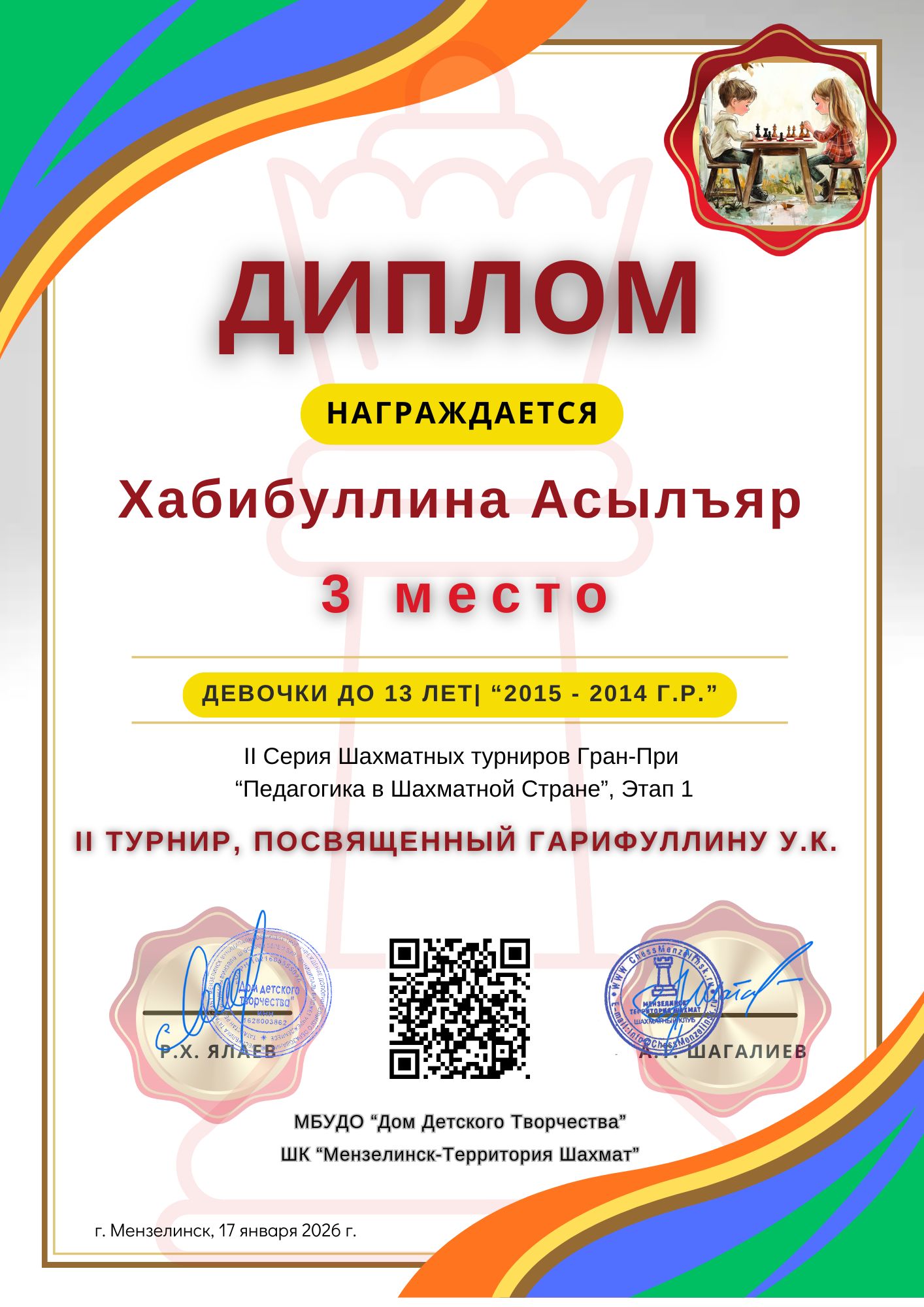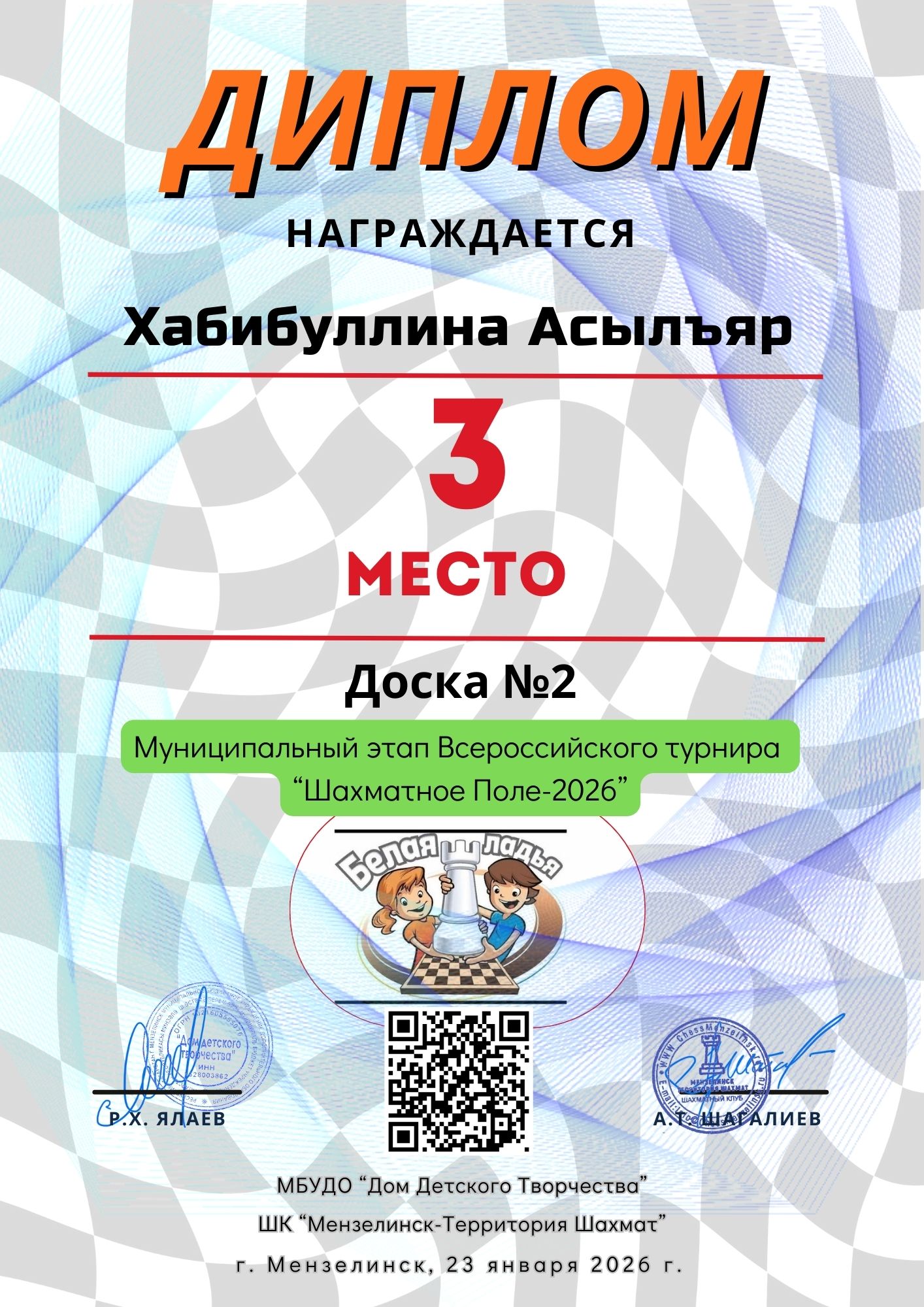 ![]() 2026.01.23| г. Мензелинск Муниципальный этап турнира "Шахматное Поле" Личный Зачет, 2-я доска, 3 место Хабибуллина Асылъяр, 2015 г.р., Урусовская ООШ |