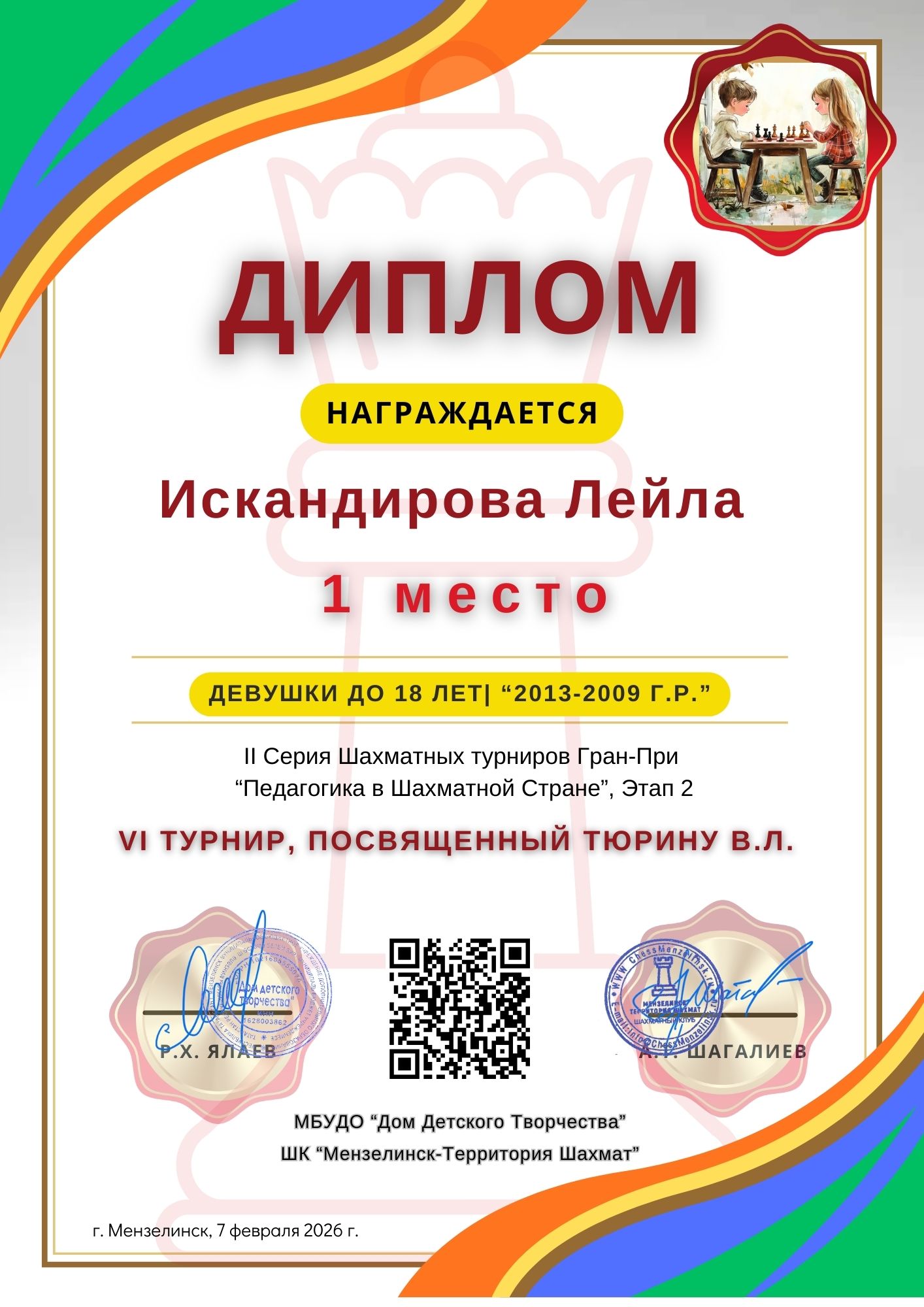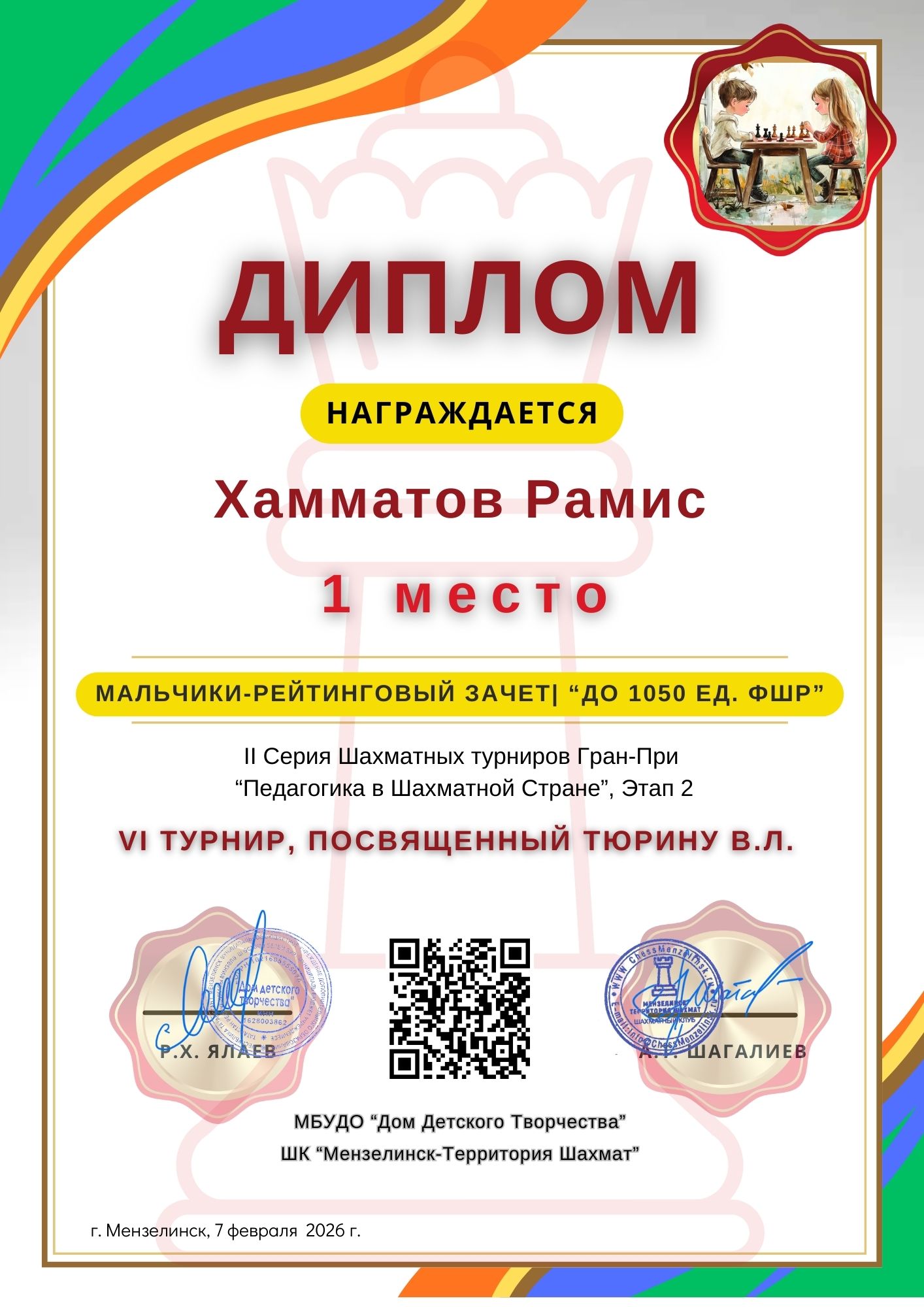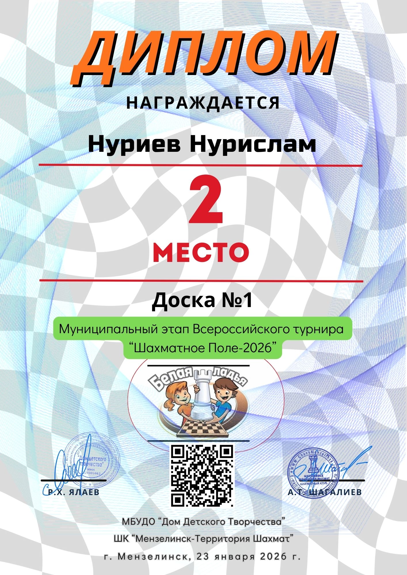 ![]() 2026.01.23| г. Мензелинск Муниципальный этап турнира "Шахматное Поле" Личный Зачет, 1-я доска, 2 место Нуриев Нурислам, 2012 г.р., Гимназия |