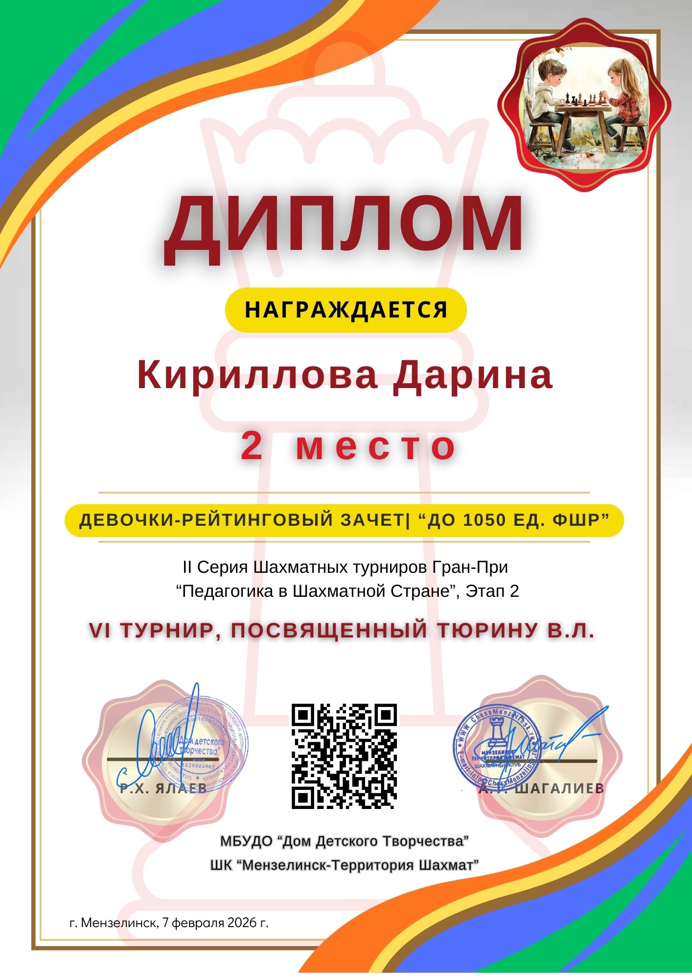 ![]() 2026.02.7| г. Мензелинск 2 этап, II Серия "ПвШС" Девочки-РЗ, 2 место Кириллова Дарина |