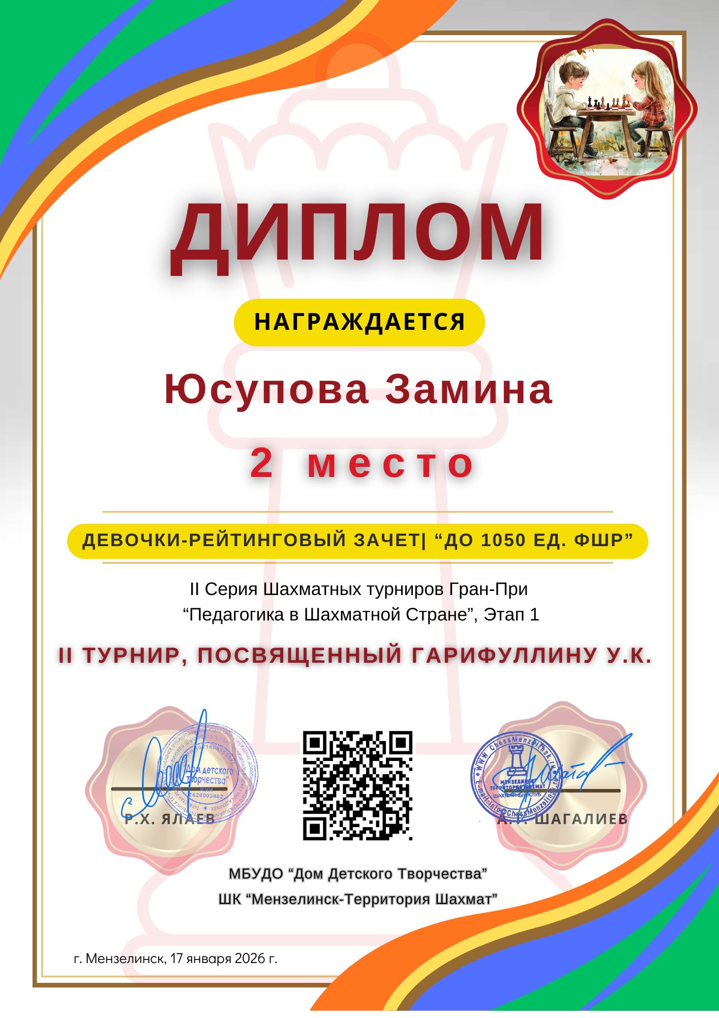 ![]() 2026.01.17| г. Мензелинск 1 этап, II Серия "ПвШС" Девочки-РЗ, 2 место Юсупова Замина |