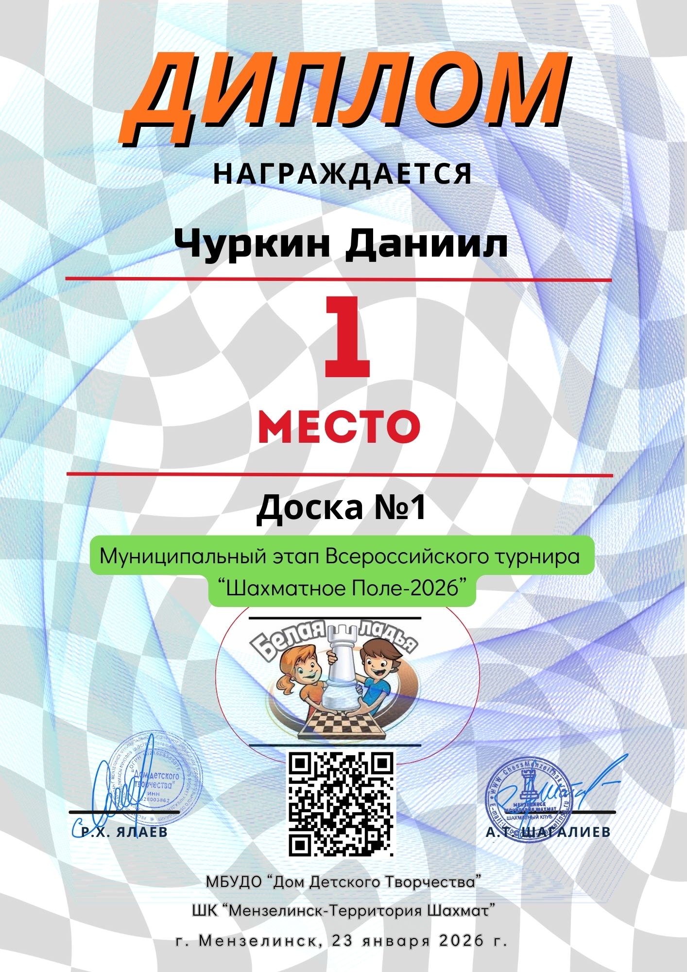 ![]() 2026.01.23| г. Мензелинск Муниципальный этап турнира "Шахматное Поле" Личный Зачет, 1-я доска, 1 место Чуркин Даниил, 2015 г.р., СОШ №1 |