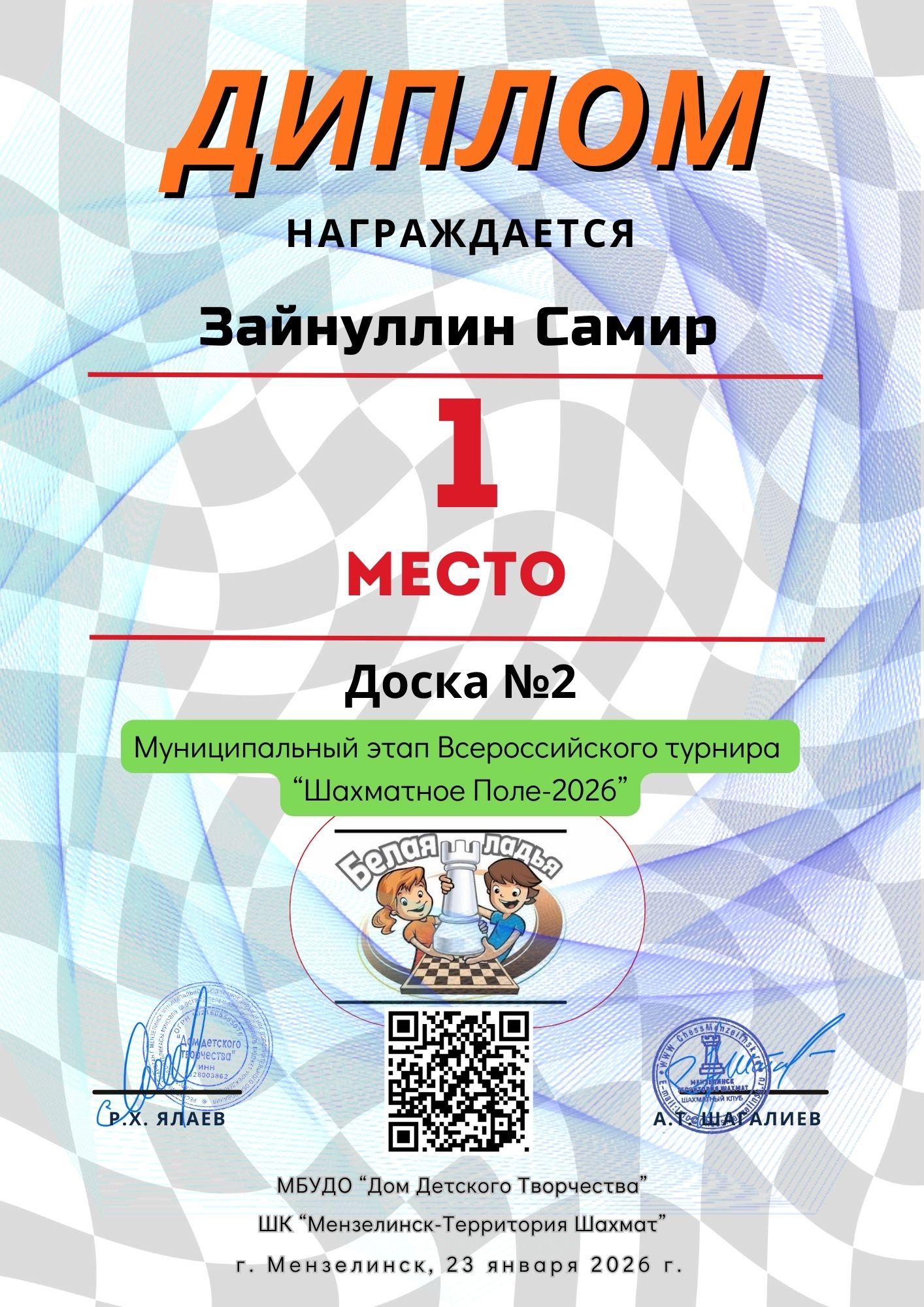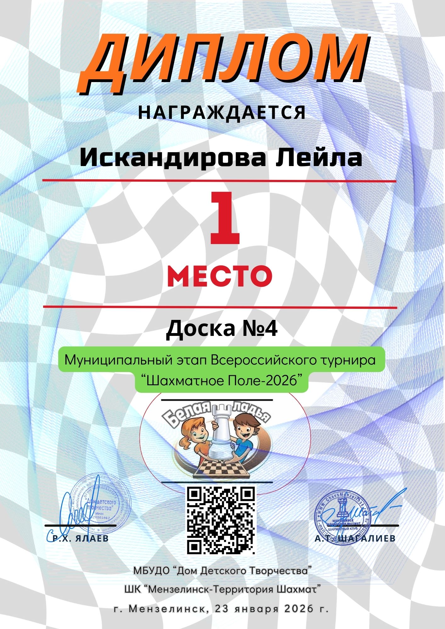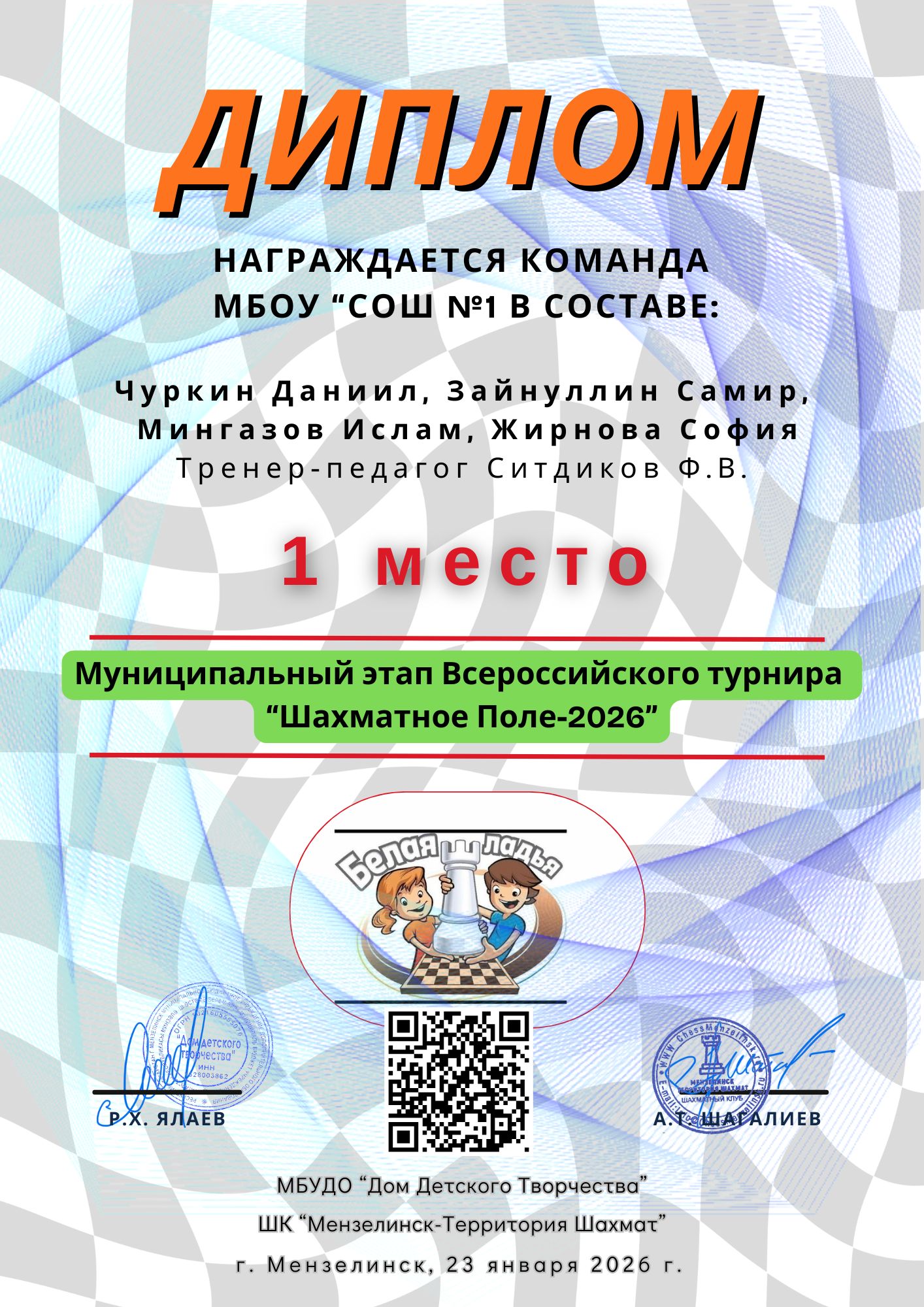 ![]() 2026.01.23| г. Мензелинск Муниципальный этап турнира "Шахматное Поле" Командный Зачет, 1 место, СОШ №1 |