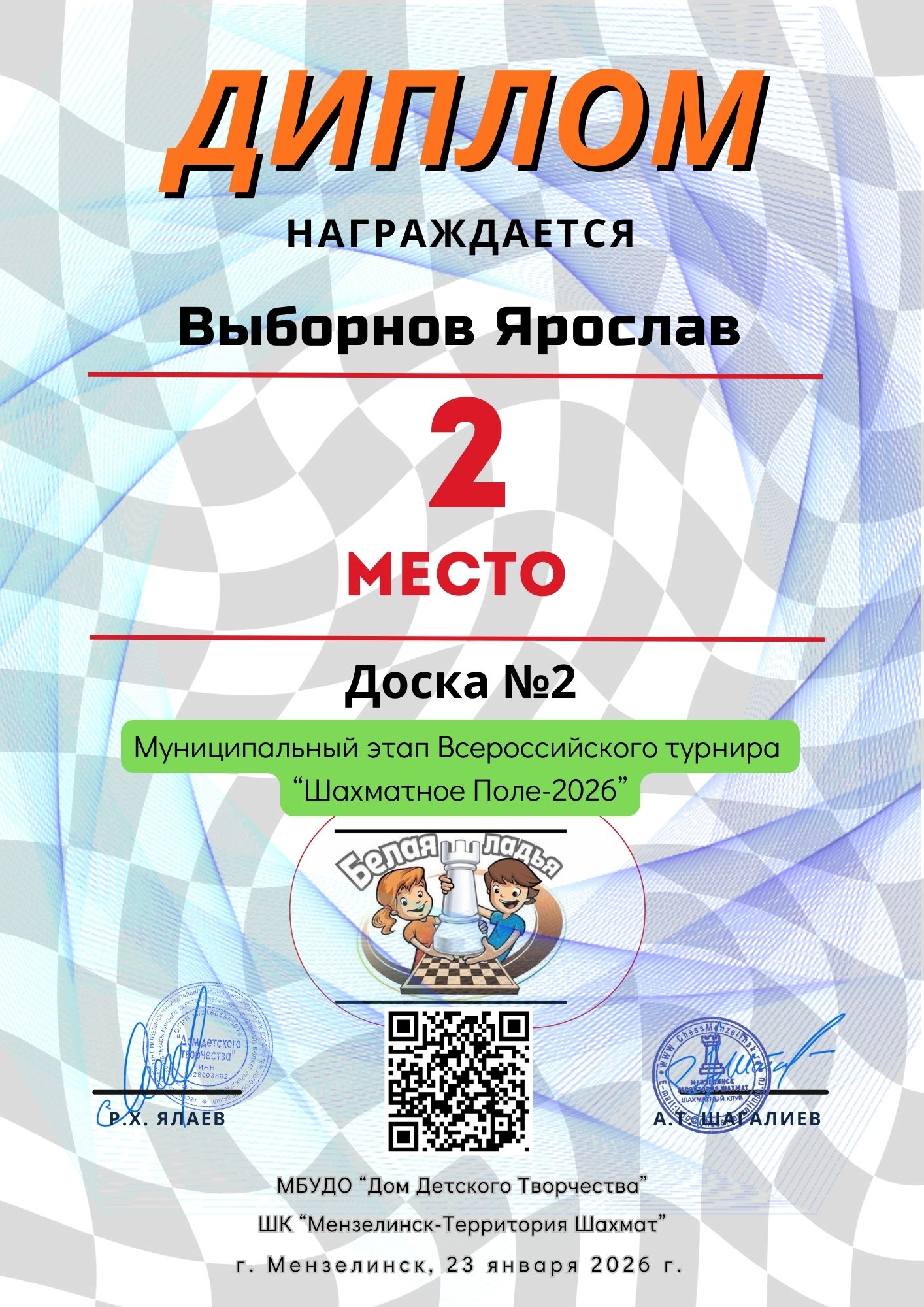 ![]() 2026.01.23| г. Мензелинск Муниципальный этап турнира "Шахматное Поле" Личный Зачет, 2-я доска, 2 место Выборнов Ярослав, 2012 г.р., СОШ №3 |