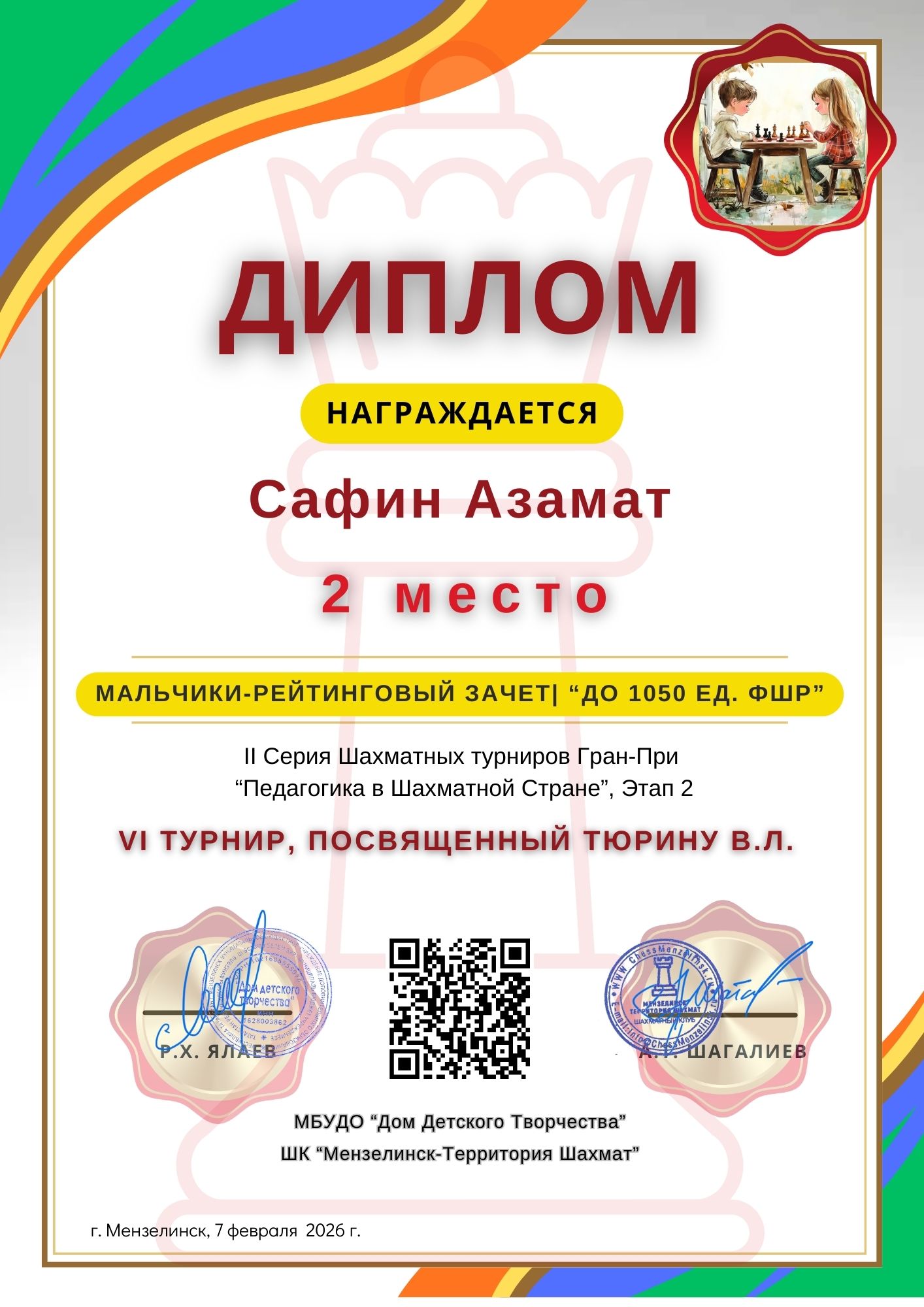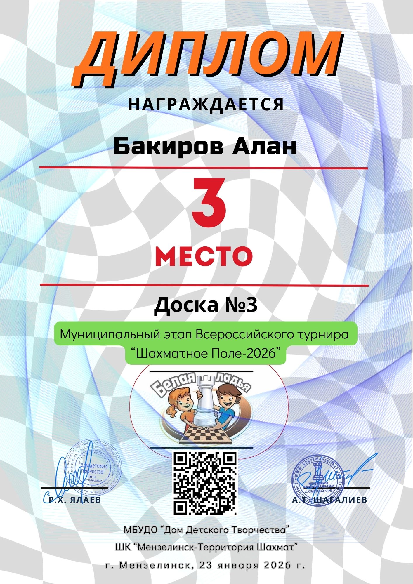 ![]() 2026.01.23| г. Мензелинск Муниципальный этап турнира "Шахматное Поле" Личный Зачет, 2-я доска, 3 место Талипов Амир, 2012 г.р., СОШ №2 |