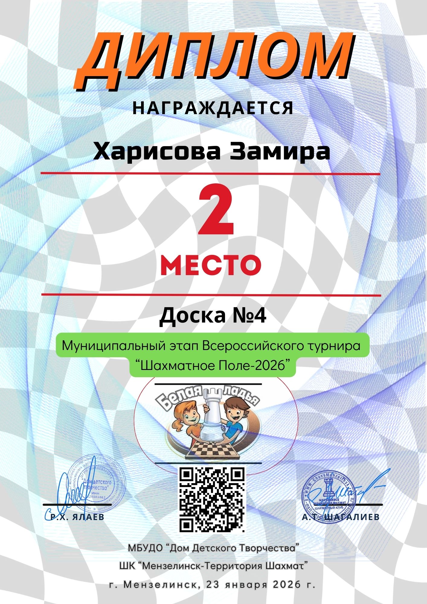 ![]() 2026.01.23| г. Мензелинск Муниципальный этап турнира "Шахматное Поле" Личный Зачет, 4-я доска, 2 место Харисова Замира, 2016 г.р., Урусовская ООШ |