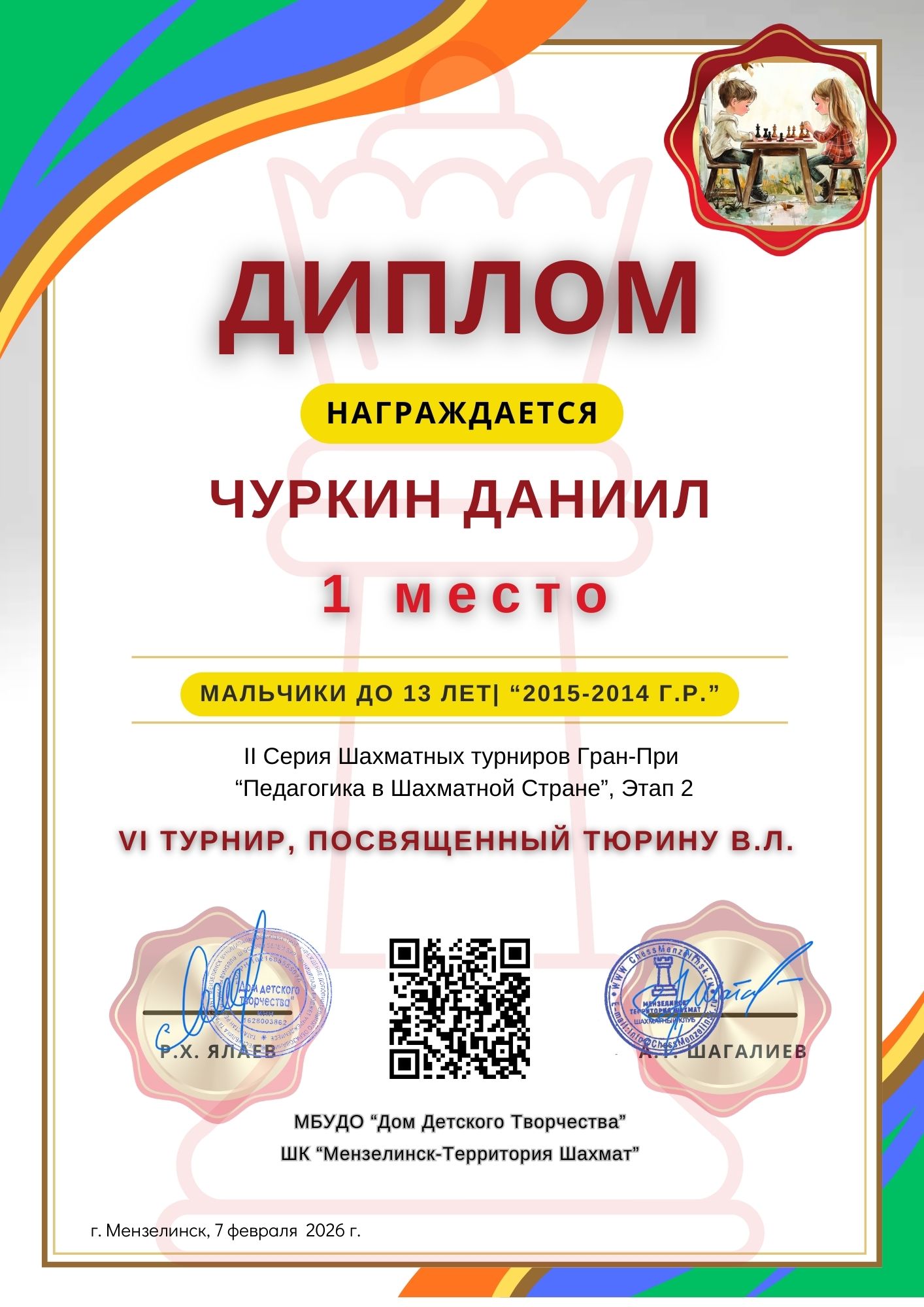 ![]() 2026.01.05| г. Мензелинск Чемпионат района по шахматам Фишера Общий Зачет, 1 место Чуркин Даниил |