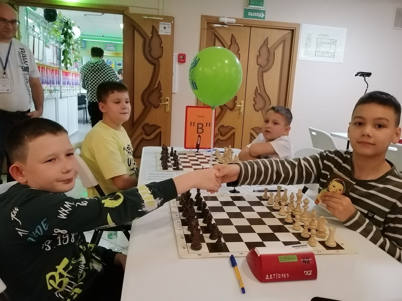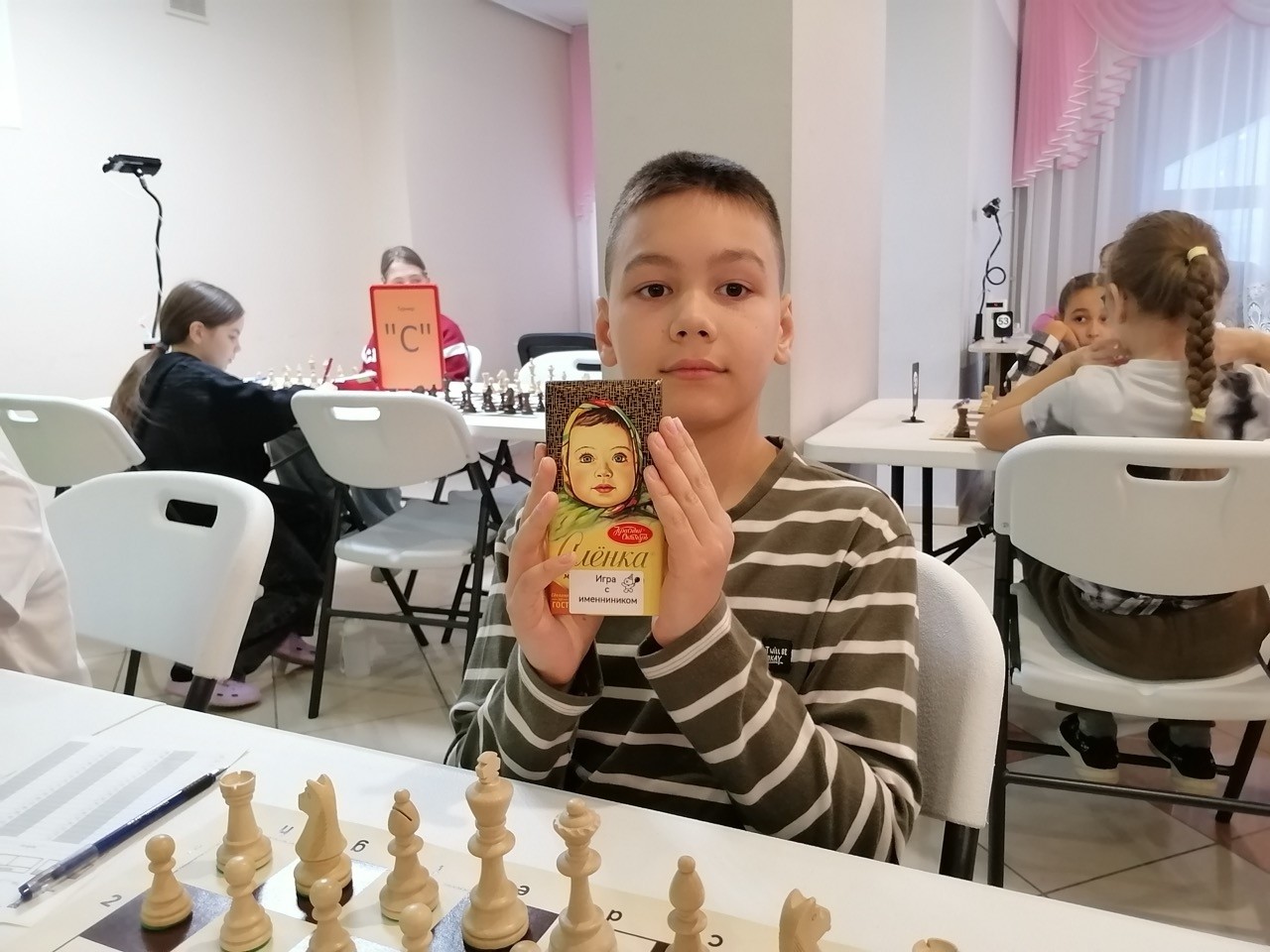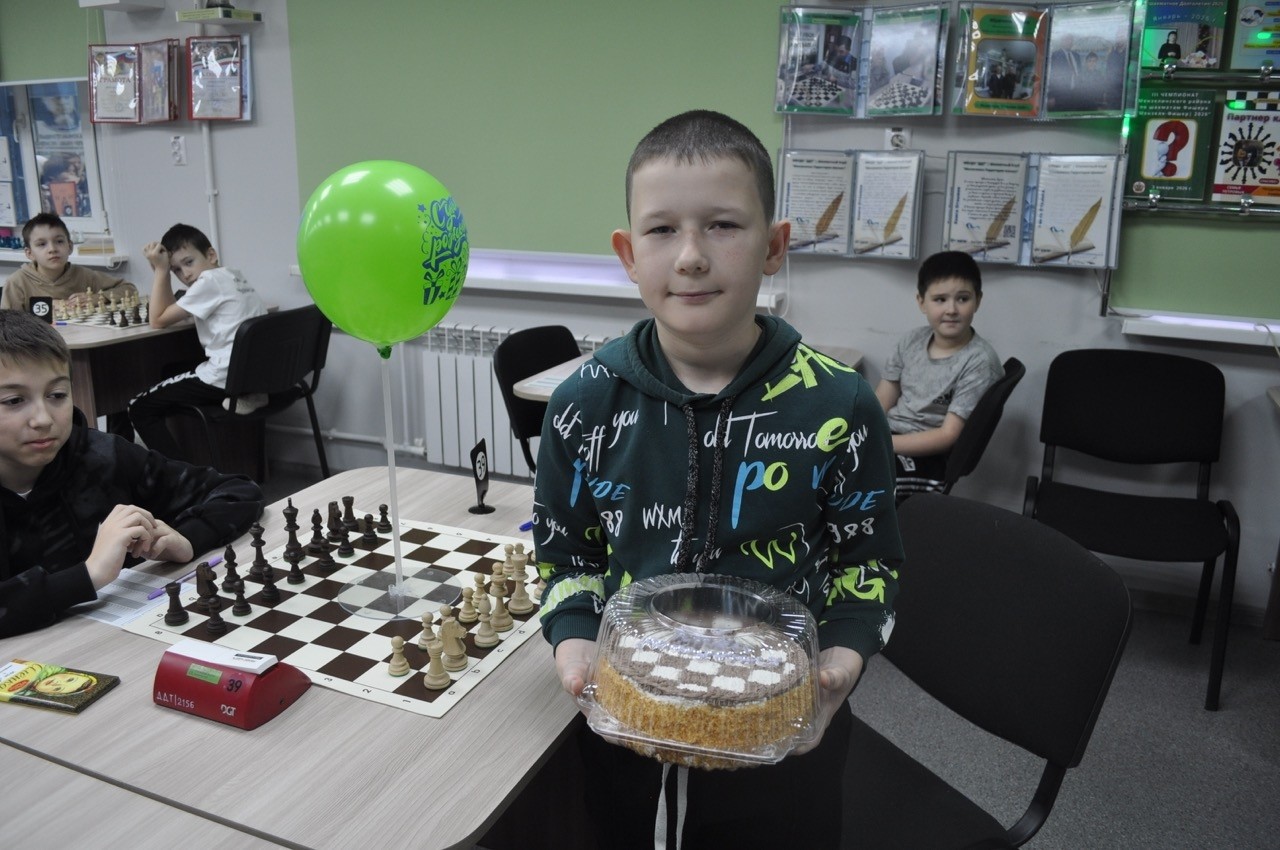 В этот день участник Гильфанов Булат из Актаныша отметил свой 11-й день рождения. В шахматном клубе существует замечательная традиция: в честь именинника его соперники также получают сладкие призы, а самого виновника торжества угощают праздничным тортом. Кроме того, стол именинника был украшен воздушным шаром с надписью "С Днем Рождения".