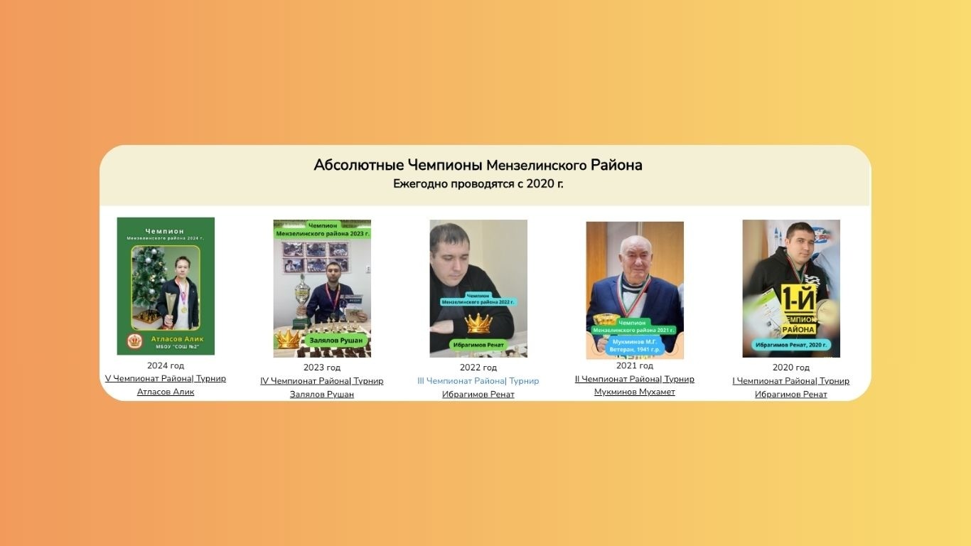 Первый чемпионат района состоялся в 2020 году, где победителем стал Ибрагимов Ренат, руководитель отдела образования на сегодняшний день.
